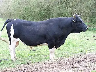 The Bretonne Pie Noir is a French breed of small dairy cattle from Brittany, in north-western France. It originates from Cornouaille and the Pays de Vannes in the départements of Finistère and Morbihan. Due to its small size, modest requirements, good productivity and ability to exploit poor and marginal terrain, it was well suited to traditional Breton agriculture.[4] A herdbook was established in 1886.[2][5] The breed was in the past numerous; at the beginning of the twentieth century there were about 500000. Numbers fell drastically during that century, and in 1976, when about 15000 remained, a breed conservation plan was begun, the first such for any breed of cattle.[4]