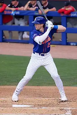 Baty was selected by the New York Mets in the first round (12th overall) of the 2019 Major League Baseball draft.[9] He signed for $3.9 million and was assigned to the Gulf Coast League Mets.[10][11] After five games, he was promoted to the Kingsport Mets before being promoted to the Brooklyn Cyclones.[12][13] Over 51 games between the three teams, he batted .234/.368/.452 with 7 home runs and 33 RBIs. Baty did not play in a game in 2020 due to the cancellation of the minor league season because of the COVID-19 pandemic.[14]