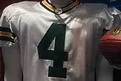 The Packers had announced plans to retire Favre's #4 jersey in the 2008 season opener.[140] Those plans were dropped when he announced plans to return to the NFL. In March 2009, the Packers indicated that the team still intends to retire Favre's number, but due to the circumstances surrounding his departure from the team, no timeline had been set.[141] Favre's #4 jersey was finally retired in 2015.[142]
