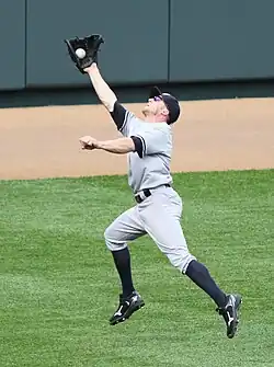 Gardner was named the Yankees' starting center fielder for Opening Day of the 2009 season on March 29, beating out Melky Cabrera for the position, although Cabrera would eventually replace Gardner as the starting center fielder.[16][17] Gardner played 108 games during the 2009 season, batting .270 with three home runs, 23 RBI, and 26 stolen bases.[15] Gardner was also part of the Yankees' postseason run, appearing in all but one of the Yankees postseason games and starting the final two games of the World Series, as the team won the Series for the first time since 2000 by beating the Philadelphia Phillies.[18]