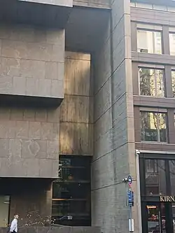 Unlike most other buildings on the adjacent stretch of Madison Avenue, the building's exterior is made of reinforced concrete with variegated gray granite cladding,[2][10] which is divided into vertically-oriented slabs.[30] The majority of the building is faced with dark gray granite, with white veining resembling curling smoke,[8] and lacks decoration for the most part.[30] There are 1,500 slabs of stone, each weighing 500–600 pounds (230–270 kg).[36] The Madison Avenue elevation features an areaway or sunken stone courtyard[10][30] (sometimes described as a moat[27][37]), which was originally intended to display sculptures.[28][37][38] Spanning the areaway is a canopied concrete bridge into the building's lobby,[29][8][30] which Architectural Forum likened to a portal and sculpture.[8] Adjacent to the southern end of the bridge is a concrete display case with a glass pane. The rest of the areaway is separated from the sidewalk by a granite parapet with two flagpoles, in addition to planting beds. The southern end of the Madison Avenue elevation has concrete cladding (in contrast to the rest of the facade) and includes a service entrance. On 75th Street, there is another areaway, as well as a service entrance and loading dock at the eastern end.[30]