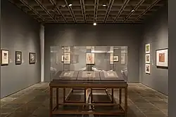 While exhibition space was made relatively bare at the museum's opening (with white walls and panels on slate floors), its permanent gallery space made use of carpets, woven wall coverings, and comfortable furniture to make the space more intimate.[64] The gallery floors are of bluestone tile, teakwood, and split pieces of slate.[29] Most galleries have slate floors, except for one of the first floor-galleries, which has teakwood floors for dance receptions.[7] The walls are white, gray, or granite-faced and relatively blank, allowing for "plenty of hanging area for the paintings inside".[5] Ceiling heights vary; the second and third floors are 12+3⁄4 feet (3.9 m), while the fourth floor is 17+1⁄2 feet (5.3 m).[5] The ceilings use a suspended grid of concrete coffers with rails for movable partitions.[5][43] The original spot lighting and indirect lighting fixtures were created by Edison Price and hung from the concrete grids;[44] there are diffusers and mirrors over each fixture.[65] Wires and lightbulb plugs are embedded throughout the ceiling grid,[7][43] which allowed artificial lighting fixtures to be arranged in a near-infinite number of ways.[43][66]