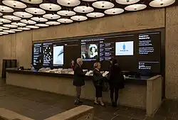 The ceiling is taken up by white circular light fixtures, each with a single bare silver-tipped bulb.[7][46][14] The interior is rich in materials – granite, wood, bronze, and leather, though muted in color.[14] Concrete walls in the lobby are bush-hammered, and framed by smooth boardformed edges;[23][47] the Met's contemporary art chair noted this as a delightful attention to detail.[23] The lobby, renovated extensively in preparation for the Met Breuer's opening, had an unoriginal gift shop structure removed, and its walls and sculptural ceiling lights were repaired. After the Met Breuer opened, the lobby featured a 32-foot-long (9.8 m) matte black LED media wall, a television screen, exhibitions, and other information.[23] Following Sotheby's renovation of the building in the 2020s, some lobby furniture was converted to display cases and cabinets.[48][49]