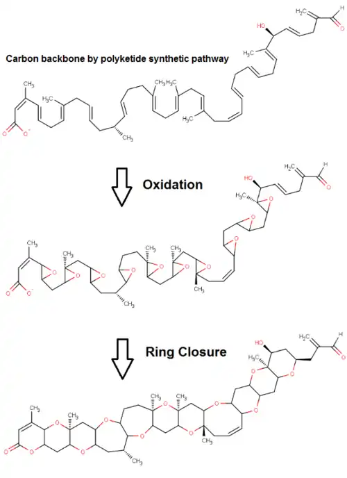 Brevetoxins share the common backbone structure of polyketides, but there are several methyl and oxygen groups that are not typical in traditional polyketide biosynthesis. Labelling studies using carbon-13 confirm that the biosynthesis of brevetoxins greatly deviates from the polyketide synthetic pathway. The proposed biosynthetic pathway for brevetoxin class compounds begins with traditional polyketide synthesis to create the carbon backbone, using carbon originating from acetate modified by the citric acid cycle. After the carbon backbone is synthesized, oxidation produces the necessary epoxides and the multi-ring system is closed. It is unclear if the methyl groups seen in BTX-B are added after cyclization or during the modification of the polyketide metabolites, but it is clear that methyl groups can originate from sources outside of acetate such as S-adenosylmethionine.