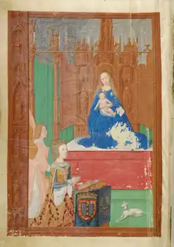 The breviary belonged originally to Eleanor, Queen of Portugal, who is depicted in prayer before the Virgin and Child in the opening miniature; it is not known, however, whether it was commissioned by the Queen herself, or whether it was a gift to her, (perhaps through the Netherlandish Hapsburg court, by Emperor Maximilian I or Margaret of Austria).[1] It was purchased by J. P. Morgan from the Parisian art dealer Hamburger Frères in 1905: it is now in the collection of the Morgan Library & Museum, in New York.[2]