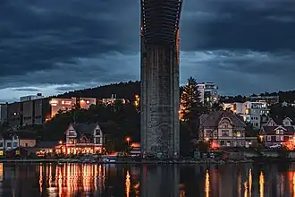 Brevik has significant industry, including cement production (Norcem, formerly Dalen Portland Cementfabrik, which is Norway's largest cement factory), workshop industry, food industry (among others Diplom-ice), and mining (Kjørholt limestone mine, which is Norway's largest mine). The town is located on the mainland and also on the small island of Sylterøya. There is a bridge over the strait between Sylterøya and the mainland. The town hall, which is an old farm estate, and Brevik Church are located on Sylterøya. Brevik has narrow and crooked streets with interesting, irregular buildings.[4]