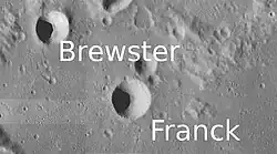 Brewster is a small lunar impact crater in the northern fringes of Sinus Amoris. It was named after the Scottish scientist, Sir David Brewster.[1] Its diameter is 9.8 km.[1] It lies to the southwest of the larger crater Römer. To the southeast of Brewster is the similar-sized Franck. This crater is cup-shaped and symmetrical, with no overlapping craters of note. A low ridge is attached to the northern rim. The crater interior has a relatively high interior albedo compared to the surrounding terrain.