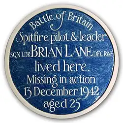 A permanent memorial plaque, organised by local resident Paul Baderman, was unveiled on Lane's childhood home in Pinner on 25 September 2011, 69 years after his presumed death.[2]