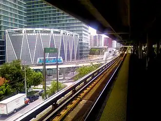 Brickell station is a Metrorail rapid transit station in Miami, Florida, serving the system's Green and Orange Lines. One of the core stations of Miami's public transport network, it serves the financial district of Brickell. Combined, the Metrorail and Metromover station complex at Brickell sees roughly 8,430 boardings each weekday, making it the system's second-busiest station.[2]