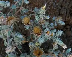 The shrub flowers in clusters of flower heads each about 1.5 centimeters long. The head is cylindrical to conical and wrapped in layers of gray woolly phyllaries whose tips curl out from the flower head. The head contains around 23 dull white to reddish-tinted yellow disc florets that stick out from the tip. The fruit is a hairy achene about 4 millimeters long with a pappus of bristles.[4]