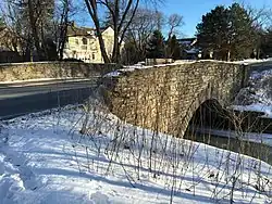 On March 8, 1937, the Edina City Council accepted the proposal by Lyle Culvert & Pipe Company to build an Armco multi-plate arch bridge. The facing was proposed to be irregularly coursed boulder stone, designed in the WPA Rustic style. Construction began in May 1937, but in July 1937, the design of the stone facing was changed from boulder stone to limestone. This was done to harmonize with the limestone veneer on the nearby St. Stephen's Episcopal Church. The construction schedule did not appear to be set back. Construction was largely complete in August 1937, and a city newsletter published in September 1937 shows the completed bridge.[1]