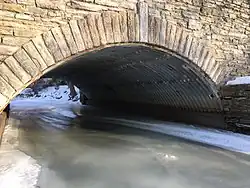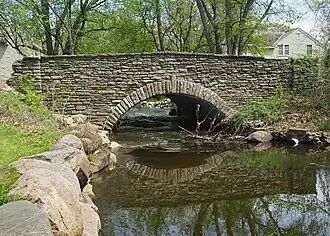 The multi-plate arch bridge design was introduced in 1931 by the Armco Culvert Manufacturer's Association. The plates are made of galvanized corrugated steel, manufactured in curved segments, and assembled on site to build an arch. The corrugations, about 6 inches (150 mm) wide and 1.5 inches (38 mm) deep, formed a very strong bridge. The multi-plate arch design was popular in the 1930s as an alternative to reinforced concrete slab-and-girder construction for bridges with a short span. The bridge could also be assembled by unskilled labor, and the stone masonry was labor-intensive, so the Works Progress Administration was able to employ a number of people in its construction. While many multi-plate arch bridges were built in Minnesota during the Great Depression, bridges of that type are increasingly rare. A 1988 survey found 35 surviving multi-plate arch bridges in the state, but in 2014, only eight of these bridges were left.[1]
