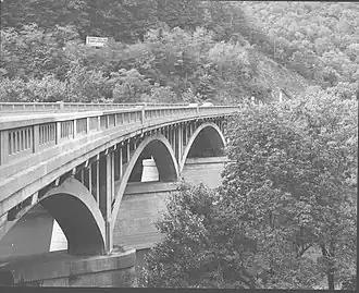 Bridge in Snake Spring Township, also known as the Narrows Bridge, is a historic concrete arch bridge located at The Narrows in Snake Spring Township in Bedford County, Pennsylvania. It was built in 1934, and is a 580-foot-long (180 m), open spandrel concrete arch bridge with five arches. The roadway is skewed and carries US 30, the Lincoln Highway, over the Raystown Branch Juniata River.[2]