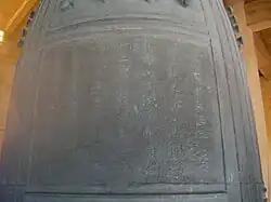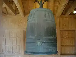 Nationally designated as an Important Cultural Property in 1978,[1] the bell is today in the collection of the Okinawa Prefectural Museum; a full-size replica hangs at the castle site.[3] It remains unclear, however, just where in or around the Seiden it was originally hung.[2] The replica bell currently hangs outside the second bailey or courtyard (Okinawan: shicha nu una), in a structure called the Tomoya, which has been reconstructed based on historical plans, maps, and images, but the original purpose of which is unknown.[4]