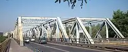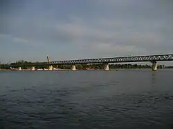 Rákóczi Bridge connects Buda and Pest across the Danube. It is renamed after the Hungarian leader Francis II Rákóczi. Built alongside the Southern Rail Bridge, this bridge is the southernmost roadway bridge in the capital; it was inaugurated in 1995. By 2015, tram line 1 was extended across Rákóczi Bridge to Buda (the western side of the city), to Fehérvári út where it connects to tram lines 18, 41 and 47.[3] On the Buda side a section of the tracks is covered by grass.[4]