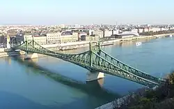 Liberty Bridge is the third southernmost public road bridge in Budapest, located at the southern end of the City Centre. It is 333.6 m in length and 20.1 m in width. The top of the four masts are decorated with large bronze statues of the Turul, a falcon-like bird, prominent in ancient Hungarian mythology.