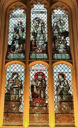 - ^ Originally dedicated to the memory of Richard and Rupert, Bridget's name was added (above the king in the lower central panel) after her death.