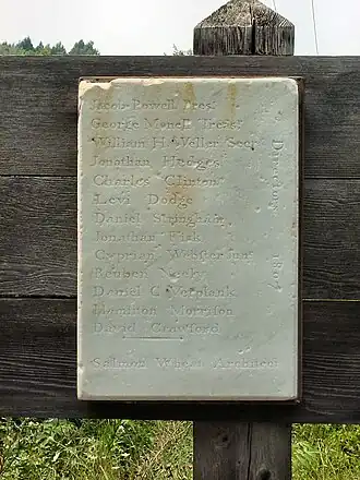 The old bridge was demolished in 1923, replaced by the present-day span (Sullivan County Bridge #285) over the Neversink River. According to a marker that was placed on the original bridge, the architect was Maj. Salmon Wheat, a farmer who lived near the present village of Howells;[2] and directors of the company were Jacob Powell,[3] president; George Manell, treasurer; William H. Veller, secretary; Jonathan Hedges, a Newburgh physician;[4] Charles Clinton; Levi Dodge; Daniel Stringham; Jonathan Fisk, a Newburgh attorney;[5] Cyprian Webster, Jr.; Reuben Neely, member of New York State Assembly;[6] Daniel C. Verplank of Fishkill;[7] Hamilton Morrison, later a Commissioner of Common Schools for the Town of New Windsor;[8] and David Crawford, a Hudson River boat captain[9] whose former residence now houses the Historical Society of Newburgh Bay and the Highlands.[10]