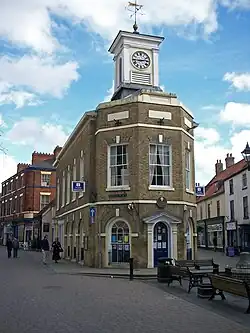 The old town is centred on the marketplace and the adjoining streets of Bridge Street, Wrawby Street, and Bigby Street. The marketplace and Wrawby Street, where much of the town's retail is located, were pedestrianized in the early 1990s. A significant number of buildings in the town centre date to the late 1700s or early 1800s and are listed, with the old town as a whole designated a Conservation Area.[23] The marketplace is dominated by the Buttercross and the Angel, a former coaching inn with an early mock Tudor façade, which is now home to Brigg Town Council and various North Lincolnshire Council services. Another former coaching inn, the Exchange, stands in Bigby Street, opposite the former manor house of the Elwes family. The Anglican church of Saint John the Evangelist, built in 1843, also lies on Bigby Street. Its style is of the Gothic Revival architecture popular at the time, but Pevsner notes the curious construction where the stone has first been carved into the shape of bricks before being laid in courses.[24]