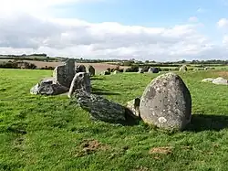Located near the village of Ballynoe within Bright civil parish, Ballynoe stone circle dates to the late Neolithic and Early Bronze Age. It features over 50 monoliths of Ordovician gritstone and granites[13] and has been linked to solar alignments and ancient burial practices. Excavations in the 1930s revealed burial cists and a long mound within the circle.[14][15] The site is mentioned in the Tochmarc Étaíne, an early Irish mythological text.