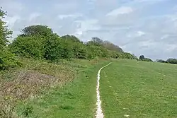 The Downland to the north of Patcham leads up to Ditchling Beacon and the western end of the Clayton to Offham Escarpment. Tegdown Hill is the next hill to the west of the downland Ditchling Road. A remarkable "ring barrow" survives (TQ 313 101) on its brow, together with the slight mounds of two other bowl barrows. Tegdown ring barrow has been described as "probably the best of this type in the county".[30] It consists of a circular bank with a ditch and a flattish interior. It lies just south of a big dried up dew pond. From Tegdown you can see the three Iron Age camps of Hollingbury Castle, Ditchling Beacon, and the Devil's Dyke. To the north of the city boundary is the long Ditchling parish.