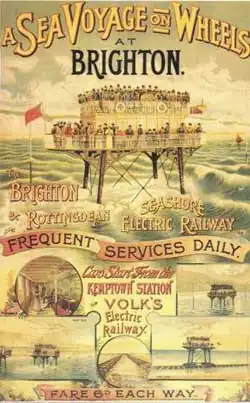The Brighton and Rottingdean Seashore Electric Railway was a unique coastline railway in Brighton, England, that ran through the shallow coastal waters of the English Channel between 1896 and 1901.[1] It was designed by Magnus Volk to extend his Volk's Electric Railway from its terminus in Paston Place to the village of Rottingdean and avoid difficult terrain. While the railway was popular and carried tens of thousands of passengers, it was ultimately abandoned to make room for new sea defences, and Volk was unable to raise the funds to construct a replacement.