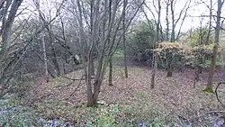 A footpath runs along the side of this site, but no geology is visible. The western half is part of a field and the eastern half is a dip in an area of wood and scrub.