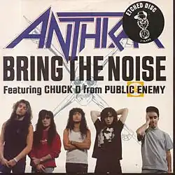 Thrash metal band Anthrax recorded a version of "Bring the Noise", which sampled the vocals from the original Public Enemy recording.[5] Chuck D has stated that upon the initial request of Anthrax, he "didn't take them wholehearted seriously", but after the collaboration was done, "it made too much sense",[6] and it was eventually included on both the Anthrax compilation Attack of the Killer B's and as the final track on Public Enemy's own Apocalypse 91... The Enemy Strikes Black album.