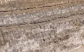 The disjointed sandstone lenses become thicker and more conspicuous from Western Sydney Regional Park and to the south of it, whereby shaping the hilly landscape between Campbelltown and Picton.[2] Namely found on Old Hume Highway, approaching Picton, the sandstone cliffs that become thicker are roughly around 200 metres (660 ft) in height. The steep banks of the sandstone lentils influence the flora of the Cumberland Plain Woodland, with such escarpments being observed in Western Sydney Dry Rainforest areas.[7] The shale runs into the Potts Hill Sandstone through a minor transitional zone of vacillating sandstone and shale bands.[8]