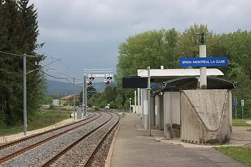Brion—Montréal-la-Cluse station (French: Gare de Brion—Montréal-la-Cluse) is a French railway station located in commune of Brion, Ain department in the Auvergne-Rhône-Alpes region. The station is also within close proximity of the commune of Montréal-la-Cluse, for which it is jointly named after. It is located at kilometric point (KP) 35.618 on the Ligne du Haut-Bugey (Bourg-en-Bresse–Bellegarde railway).