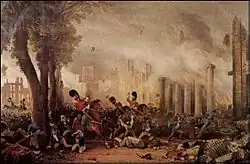 Four rioters were killed and 86 wounded, although many more are believed to have perished in the fires set by the rioters, with a total death toll put as high as 500.[7] Along with the commander of the 3rd Dragoons troop, Captain Warrington, Brereton was later court-martialled for leniency, but Brereton shot himself before the conclusion of his trial.[10][11] Approximately 100 of those involved were tried in January 1832 by Chief Justice Tindal.[12] Four men were hanged despite a petition of 10,000 Bristolian signatures, which was given to King William IV.[10] The mayor, Pinney, was tried for negligence but exonerated.[13]