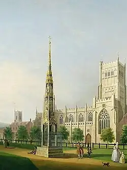 As Bristol prospered, the cross became an obstruction to traffic. In 1733, a council meeting recorded the complaint that it was too associated with Catholicism (“Consider that we are protestants, and that popery ought effectually to be guarded against in this Nation… a ruinous and superstitious Relic, which is at present a public nuisance”) and in the same year a nearby silversmith, John Vaughan, (who occupied the building later known as the Dutch House) complained that the cross threatened his life and property whenever there was a high wind and so persuaded the magistrates to have the cross taken down.[10] The parts were stored in the guildhall until Alderman Price and other citizens arranged for it to be erected again in spring 1736 on College Green by the cathedral. It was there admired as a quaint antiquity but it only took thirty years for it once again to be thought an obstruction. This time, the complaints came from the visitors who had come to the spa of Hotwells. They were wont to promenade on the green in line abreast and the cross impeded the great numbers so inclined – lines of eight or more. A fund was collected to improve the green as a promenade but this was exhausted in raising the green. The cross was once again removed in August 1762, and the pieces of the cross lay disassembled in the great cloister of cathedral. In October 1764, Dean Cutts-Barton then gave it to Henry "the Magnificent" Hoare and the materials except the very worn lower columns were carted away to adorn his grand estate of Stourhead in Wiltshire, where it was rebuilt in 1765.[6] It remains there now in the care of the National Trust.