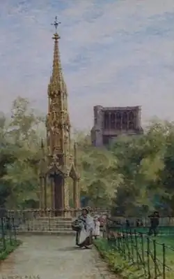 The Victorian citizens of Bristol sought to regain their cross but the original was now too fragile to be moved again. In 1851 they commissioned architect John Norton to build a replica which would again stand upon College Green.[11] Norton inspected the original closely to copy its design and then engaged John Thomas, the celebrated mason and stone carver who had recently worked upon the new Palace of Westminster, to construct the body of the cross. The funds for the work were exhausted after only one statue had been completed – of Edward III – and so the replica stood for many years with the other alcoves remaining empty. The remaining statues, commissioned from a prolific craftsman of the region, Harry Hems, were eventually installed in 1889, after the cross had been moved from the apex to the centre of the green to make way for the new jubilee statue of Queen Victoria.[6]