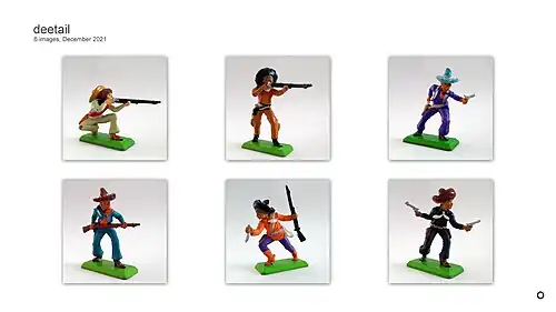 In 1971, Britains began phasing out its plastic Herald Miniatures produced in Hong Kong since 1966, with Herald eventually ceasing production in 1976. New Deetail figures were produced moulded in PVC plastic rather than polythene and using plug-in type arms, which were glued to bodies resulting in poses previously unavailable.[1] Figures were moulded with a tee shaped "footlug" on the feet of each figure that allowed secure attachment to sturdy metal bases. These rectangular metal bases ensured figures stood better than rival manufacturers products and paid homage to Britains hollowcast metal figures as well as being thought by consumers to be of "better value" due to their heavier weight.[2]