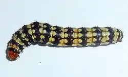 The larvae are aposematically coloured in pale yellows on blacks and browns. They are unpalatable to most vertebrate predators, and also poisonous, feeding as they do, on largely unpalatable and poisonous plants. They are slightly bristly, but the bristles seem to be sensory rather than irritant. Typically they grow to about 40 mm long before pupation.[4]