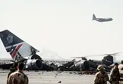 The empty 747, which had remained at Kuwait International Airport throughout the war, was destroyed on the ground by an aircraft attack during the latter stages of the conflict; the destruction may have been an intentional act of the US military to prevent its use by the Iraqi military.[2] Alternatively, the aircraft may have been destroyed by Iraqi ground forces during their withdrawal from Kuwait.[3] As a consequence of its destruction, British Airways was able to collect on the airliner's insurance.[2] Two of the aircraft's landing gears were salvaged and are displayed at Waterside, British Airways' headquarters at London Heathrow.[12]