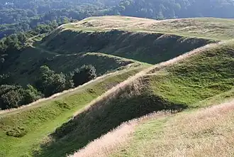The Shire Ditch, or Red Earl's Dyke, runs north and south of British Camp along the ridge of the hills. It was created in 1287 by Gilbert de Clare, the Earl of Gloucester, following a boundary dispute with Thomas de Cantilupe, the Bishop of Hereford.[6] Recent research has shown that the Shire Ditch might actually be much older. Indeed, there is some evidence that it may have started life as a prehistoric trackway running from Midsummer Hill fort to the Worcestershire Beacon, the highest hill in the range over three miles to the north of the Camp.