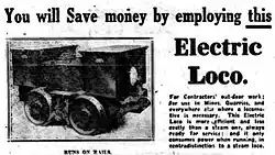- No 2 battery locomotive for use in mines, tunneling and general works. 150 example of this model were in use in England, and they were being used for the extension of the London Underground and a smaller size by London County Council on extensions to the main sewers.