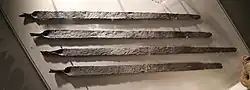 Currency bars have been found in four forms known as sword-shaped, spit shaped, plough-shaped and bay-leaf-shaped.[2] It has been suggested that these shapes were used to show the origin of the bars.[2] The bars generally weigh between 0.5 and 0.3 kg[2] Spit shaped bars are the most commonly found representing half of all finds.[3] Sword shaped bars make up another 40 percent.[3]