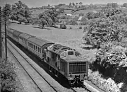 The locomotive had four main Paxman 12RPH 12-cylinder engines, each producing 500 brake horsepower at 1,500 rpm. Each engine was connected to the gearbox via a hydraulic coupling, which could be filled with oil to transmit power or drained to disconnect that engine from the transmission. The engine outputs were combined in pairs by two sets of differential gearing, and the output shafts from these two gearsets were then combined by a third differential gearset to drive the main output shaft.[3] Each differential input shaft was provided with a mechanism to prevent backwards rotation when the couplings were drained. Since this could cause the drive mechanism to lock up if the locomotive were to be pushed backward a vacuum-operated clutch was included in the geartrain.[4]
