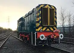 Class 08/9 locomotives were modified from the standard class by being given headlights and cut-down bodywork in which the overall height was reduced to 11’ 10" (3.61 m), for use on the Burry Port and Gwendraeth Valley Railway up to Cwmmawr. In 2007, three were used on infrastructure trains on the Manchester Metrolink.[8]