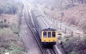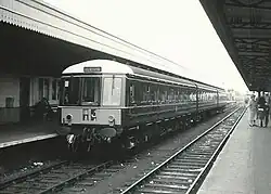 Twenty nine 116 units (50050-50078, 59000-59028 and 50092-50120) were first introduced into service on 17 June 1957, operating from Birmingham Snow Hill.[9] The 116 was used extensively around the commuter belts of Birmingham before being used on longer routes to Oxford and Worcester from spring, 1958.[10] The type was a familiar sight on the Cross City Line, the Rugby–Birmingham–Stafford line and across the West Midlands for the next thirty years, including services between Leamington Spa and Stratford-Upon-Avon. Several units were painted in West Midlands PTE livery.[11]