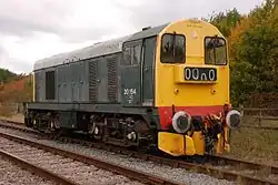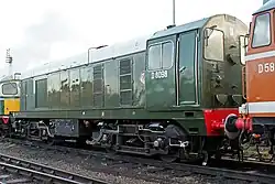 D8000 was delivered in June 1957 in overall green livery, with grey footplate,[6] red bufferbeams and a grey roof extending down the bodyside to the edge of the roof panels.[15] The original batch of 10 locos bore the BR crest facing towards the nose on both sides, used yellow sans serif numerals, and had green cab roofs; locos from D8010 had the correct pattern BR crest, white numerals and grey cab roof. This was adjusted after D8103[6] to include a small yellow warning panel, although the precise size and detail of such panels varied somewhat.[4]