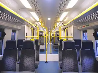 It is a derivative of the Class 375 Electrostar specially designed for use on the high-volume metro routes running from Central London, and through Southeast London to Kent. The changes are mostly focused on increasing the trains’ capacity and decreasing station dwell times. The Class 376's doors are wider to allow more passengers to board at once, and are metro-style sliding pocket doors which are faster and more reliable than the Class 375's plug doors, although they do not close flush with the bodyside and hence are less aerodynamic and do not provide as much thermal insulation. The units have 2 sets of double doors per side in each carriage. Also, these trains do not have air conditioning, with hopper style windows available for ventilation. In order to provide more standing room, the trains also have fewer seats, more handrails, and no on-board toilets (South Eastern promised to provide additional facilities in their stations to compensate) and, as a consequence, these trains are limited to in-service journey times of 1 hour.