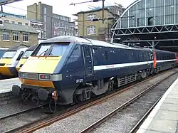 During the privatisation of British Rail ownership of the Class 91 fleet passed to Eversholt Rail Group, which in turn leased the fleet to its various operators.[16] Eversholt put all 31 locomotives through a £30 million heavy overhaul and refit process (known as Project Delta) between 2000 and 2003, seeking to improve the fleet's reliability. Rail Magazine described it in March 2001 as being necessary because "eight out of ten failures on Class 91s were caused by the sub-standard electrics", and further noted that problems with relays in particular were the "third-biggest" cause of failures.[16] The refit was performed by Adtranz (later Bombardier Transportation), with technical support from Alstom, and involved upgrades to the bogies, electrical systems, air compressors, and parking brakes; alterations to the cab layout at the Number 1 end; the replacement of the original gearboxes with newly designed Voith models; and the installation of TPWS and a new air-cooling system.[16] Overhauled units had their numbers increased by 100; thus 91001 became 91101 and so on – with the exception of 91023, which was renumbered 91132 due to sensitivity around its involvement in both the Hatfield and Selby accidents.[16]