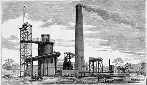 During the summer of early 1877, the dry weather caused a shortage of fresh water to the plant. The boilers were run on sea water for a time, but the furnace needed to be shut down. Pipes were laid to replace open water channels and the furnace was relit in March 1877.[35][5]