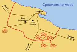 On the morning of 5 January, while Australian forces were still mopping up the southern cauldron at Bardia, Wavell ordered the 7th Armoured Brigade of the 7th Armoured Division to advance west, pass Tobruk and cut it off. By 6 January the brigade had reached El Adem (now Tobruk Airport). By 7 January the bulk of the British forces had arrived and cut off Tobruk.[4] The 19th Australian Brigade group placed itself opposite the eastern defences of Tobruk and the 16th Australian Brigade group took over on the western side. The 4th Armoured Brigade moved to the west of the city, the 7th Support Group blocked the western exits and the 7th Armoured Brigade screened the force from interference from the west.