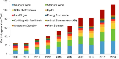Electricity generated (TWh) from renewable sources in the United Kingdom between 2009 and 2018.[156]