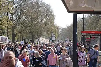 On 16 March, the British government started holding daily press briefings. The briefings were to be held by the Prime Minister or government ministers and advisers. The government had been accused of a lack of transparency over their plans to tackle the virus.[58] Daily briefings were also held by the devolved administrations of Northern Ireland, Scotland and Wales.[59] The speakers at the daily press briefings were accompanied by sign language interpreters. British sign language is a recognised language in Scotland and Wales, with interpreters standing 2 metres behind Ministers. Northern Ireland's briefings had both British and Irish Sign Language interpreters who were shown on a small screen in the press conference room. The British government briefing did not have an interpreter in the room or on a screen leading to a Twitter campaign about the issue. The government reached an agreement to have the press conferences signed on the BBC News Channel and on iPlayer in response to the campaign.[60] In response to this a petition was created by Sylvia Simmonds that required the government to use sign language interpreters for emergency announcements.[61] Legal firm Fry Law looked to commence court proceedings as they said the government had broken the Equality Act 2010, but also said that the government was doing the bare minimum and were crowdfunding to cover the government's legal costs if they lost.[60]