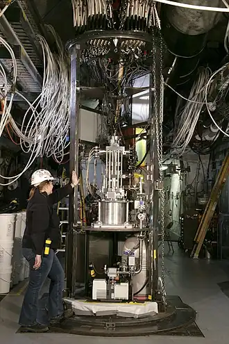 ![]() Krakatau subcritical experiment being lowered into the floor of the tunnel of the U1a Complex at the Nevada Test Site (2006). The cables extending from the hole will carry data from the experiment to recording instruments. | |